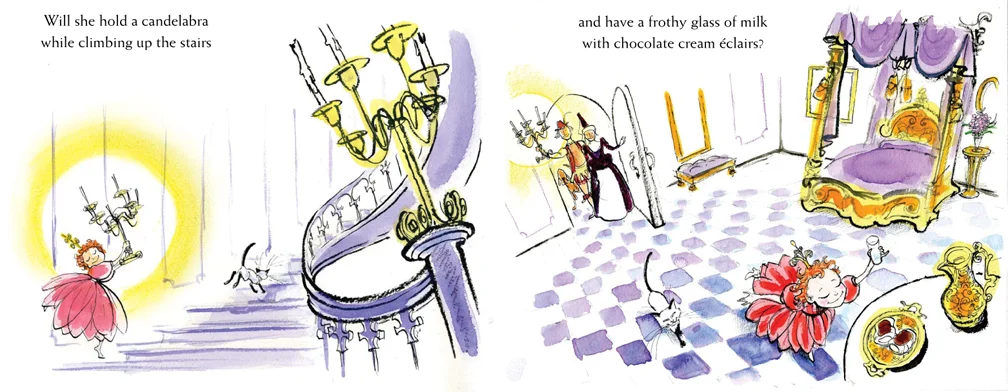 When a little girl pretends she’s a real princess, her imagination soars and her bedtime routine is transformed into a majestic affair. While practicing curtsies on her way to bed, she gets the royal treatment: chocolate cream Éclairs, glass slippers, ladies-in-waiting, a tiara—even a bubble bath with a special fluffy towel to dry her toes. Being a princess is so much fun! But at bedtime, there’s one thing a little girl—or a princess—always gets: a kiss before saying goodnight.
